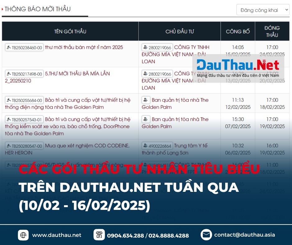 Trong thời gian từ 10/02 - 16/02/2025, trên Hệ thống mạng đấu thầu tư nhân DauThau.Net đang mời thầu, tìm nhà thầu chào giá các gói thầu sau: