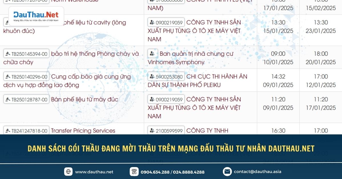 Trong thời gian từ 13/01 - 19/01/2025, trên Hệ thống mạng đấu thầu tư nhân DauThau.Net đang mời thầu, tìm nhà thầu chào giá rất nhiều gói thầu ở các lĩnh vực khác nhau, đến từ các đơn vị, doanh nghiệp uy tín, bao gồm gói thầu:
