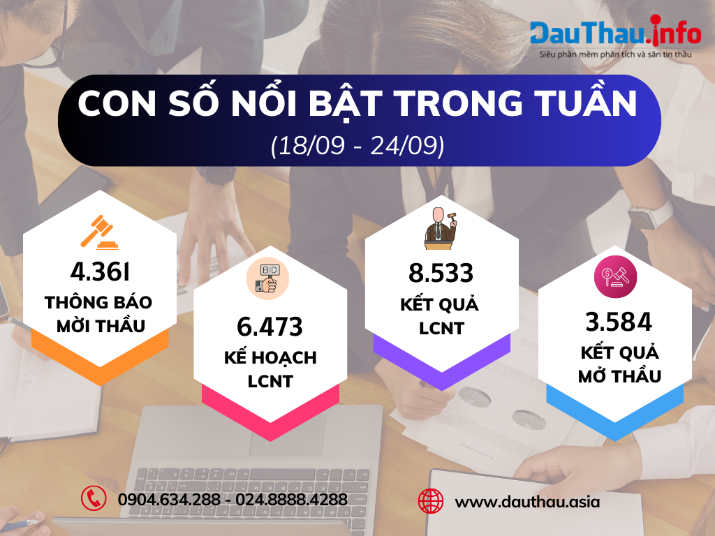 Dưới đây là những con số ấn tượng trong tuần qua (18/09 - 24/09/2023), được thể hiện trên phần mềm DauThau.info, mà Hệ sinh thái Đấu Thầu đã tổng hợp được.